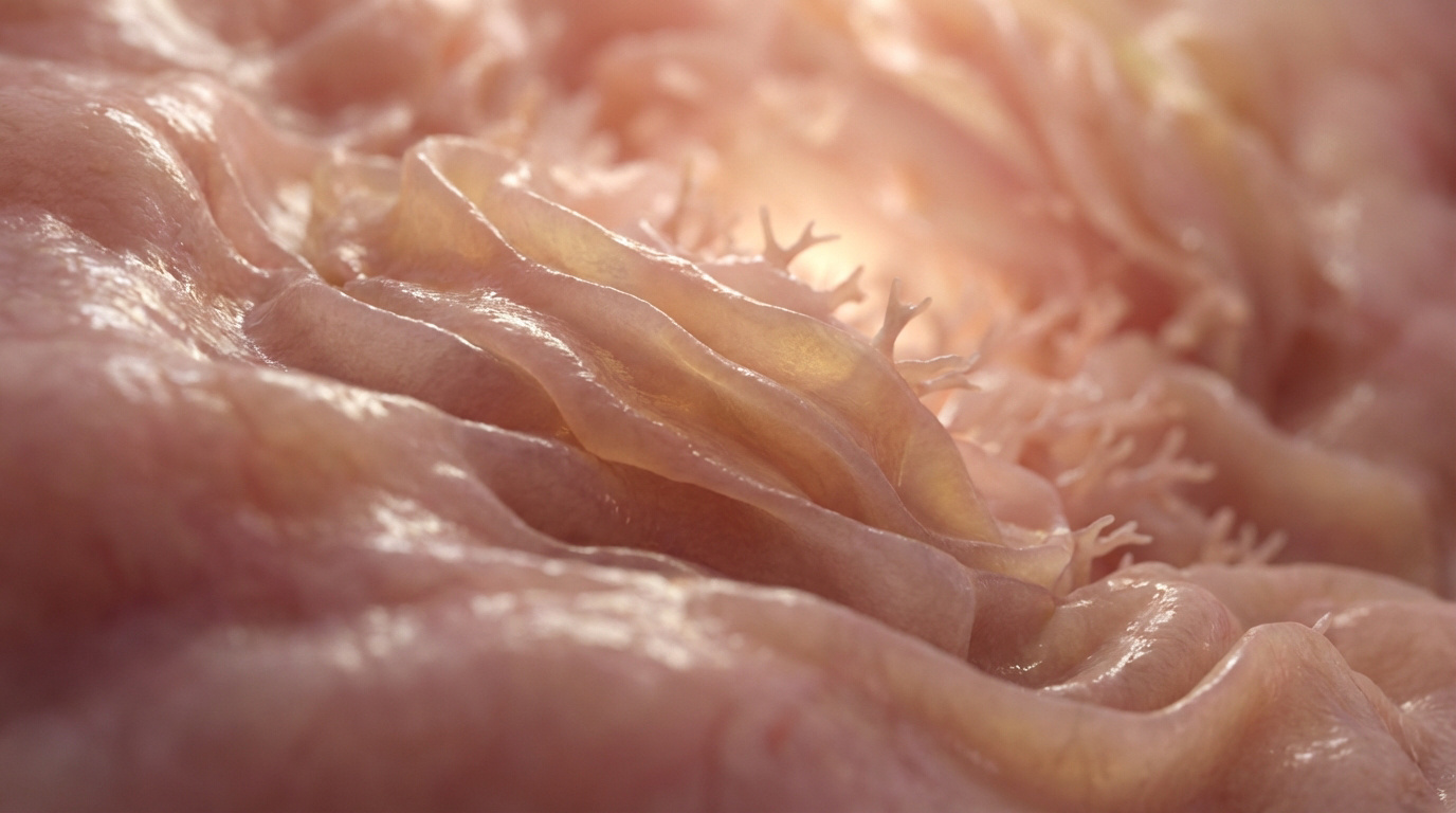 Gros plan microscopique de l'endomètre utérin, montrant une surface rose-orangée plissée avec de fines projections.